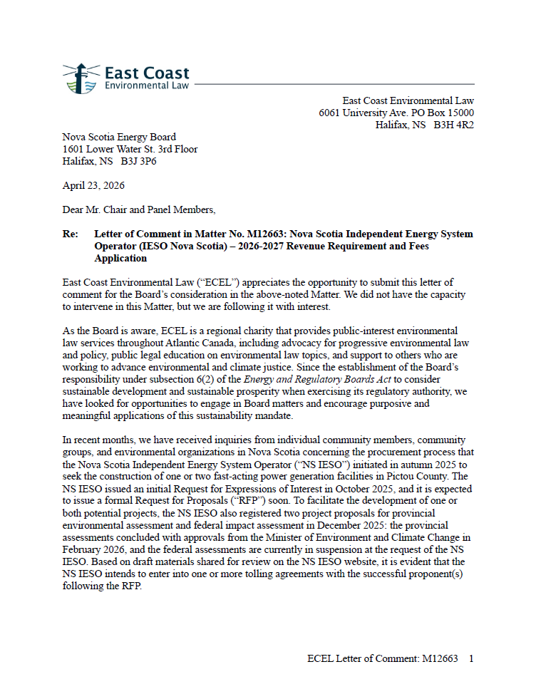 Letter of Comment in Matter No. M12663: Nova Scotia Independent Energy System Operator (IESO Nova Scotia) – 2026-2027 Revenue Requirement and Fees Application Speaking Notes & Submissions Apr 23 Written By East Coast Environmental Law Click here to view Nova Scotiaclimate changeEnergy East Coast Environmental Law